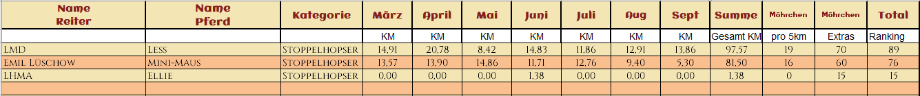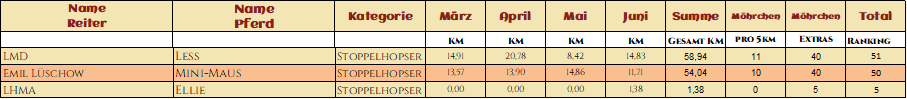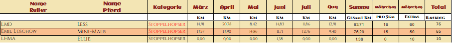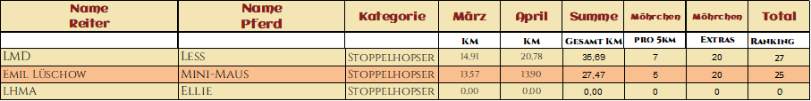 WOW! Was für ein Auftakt im März! So viele tolle Teams haben sich angemeldet! Wahnsinn! Und es wurden so viele tolle Videos, Fotos und Geschichten eingereicht. Wir sind überwältig über so eine tolle Zusammenarbeit. Danke das ihr so viel Spaß dabei habt! In fast jedem Video wurde gelacht, geblödelt oder Outtakes gezeigt, Herrlich, Danke! Das angucken und auswerten der eingereichten Bilder und Videos macht uns so so viel Spaß und ist das schönste für uns an dieser Challenge! Und wir hatten wirklich viel zu schauen und zu staunen! Das Jacken Video hat uns voll Überzeugt, ihr seid alle gut gewappnet! Tolle Pferde, tolle Menschen, ganz großartig! Schöner hätten wir uns den Start mit euch gar nicht vorstellen können! Die Highlights werden noch ein schönes Plätzchen auf der Homepage finden, da seid sicher! Hier nun aber erst mal die Auswertung der ersten Monats und was sollen wir sagen, ihr habt voll gerockt! Einige kommen jetzt aus ihrem Winterschlaf und werden bald durchstarten und einige haben schon deutlich gezeigt das sie Startklar sind, Mega! Bei einigen deutet sich wahrscheinlich ein kleiner Wechsel der Kategorie, ihrer Motivation entsprechend an, aber da schauen wir mal wie es bei den Paaren weitergeht. Wahnsinn was ihr schon im ersten Monat gezeigt habt! Danke das ihr voll dabei seid! Wir sind echt gespannt wie es weitergeht mit euch! Hier nun endlich eure Ergebnisse!