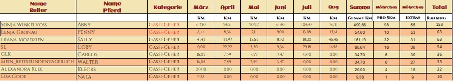 Und schon ist der Juli auch schon vorbei! Die Sonne kam und ging und ihr habt euch nicht beirren lassen und wart fleißig am Aufgaben erledigen und habt euch im Gelände vergnügt und einfach das Wetter genossen. Es macht uns immer noch so unglaublich viel Spaß mit euch! So viele Nachrichten, Bilder und Videos wieder dabei gewesen und viel persönliche Highlights von euch, die ihr mit eurem Pferd geschafft habt! Die Wasseraufgabe war für einige eine Herausforderung, die ihr wirklich fair und toll mit eurem Pferdischen-Team-Partner gelöst habt und uns war es eine riesen Freude das alles zu sehen! Dieses Mal wollen wir keine langen Reden schwingen und euch die Zwischenstände einfach zeigen :)