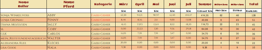 Und schon ist der Juli auch schon vorbei! Die Sonne kam und ging und ihr habt euch nicht beirren lassen und wart fleißig am Aufgaben erledigen und habt euch im Gelände vergnügt und einfach das Wetter genossen. Es macht uns immer noch so unglaublich viel Spaß mit euch! So viele Nachrichten, Bilder und Videos wieder dabei gewesen und viel persönliche Highlights von euch, die ihr mit eurem Pferd geschafft habt! Die Wasseraufgabe war für einige eine Herausforderung, die ihr wirklich fair und toll mit eurem Pferdischen-Team-Partner gelöst habt und uns war es eine riesen Freude das alles zu sehen! Dieses Mal wollen wir keine langen Reden schwingen und euch die Zwischenstände einfach zeigen :)