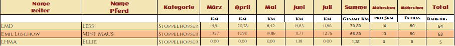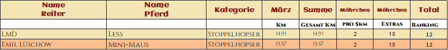 WOW! Was für ein Auftakt im März! So viele tolle Teams haben sich angemeldet! Wahnsinn! Und es wurden so viele tolle Videos, Fotos und Geschichten eingereicht. Wir sind überwältig über so eine tolle Zusammenarbeit. Danke das ihr so viel Spaß dabei habt! In fast jedem Video wurde gelacht, geblödelt oder Outtakes gezeigt, Herrlich, Danke! Das angucken und auswerten der eingereichten Bilder und Videos macht uns so so viel Spaß und ist das schönste für uns an dieser Challenge! Und wir hatten wirklich viel zu schauen und zu staunen! Das Jacken Video hat uns voll Überzeugt, ihr seid alle gut gewappnet! Tolle Pferde, tolle Menschen, ganz großartig! Schöner hätten wir uns den Start mit euch gar nicht vorstellen können! Die Highlights werden noch ein schönes Plätzchen auf der Homepage finden, da seid sicher! Hier nun aber erst mal die Auswertung der ersten Monats und was sollen wir sagen, ihr habt voll gerockt! Einige kommen jetzt aus ihrem Winterschlaf und werden bald durchstarten und einige haben schon deutlich gezeigt das sie Startklar sind, Mega! Bei einigen deutet sich wahrscheinlich ein kleiner Wechsel der Kategorie, ihrer Motivation entsprechend an, aber da schauen wir mal wie es bei den Paaren weitergeht. Wahnsinn was ihr schon im ersten Monat gezeigt habt! Danke das ihr voll dabei seid! Wir sind echt gespannt wie es weitergeht mit euch! Hier nun endlich eure Ergebnisse!