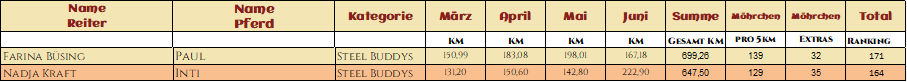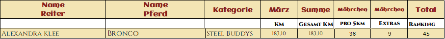 Wie hätte es bei diesem Namen auch anders kommen sollen :) Lara und ihr Buddy sind wirklich etwas ganz besonders und sie verbindet so viel Wertschätzung und Vertrauen! Wir durften ihre Geschichte hören und konnten jeden Monat über ihre Verbundenheit liebäugeln. So ist es auch keine Überraschung das die beiden 585,70km zusammen im Gelände verbrachten und mit geschickt, Witz und Charme auch fleißig ihre Extraaufgaben lösten und somit 199 Möhrchen sammelten! Liebste Lara, bleib so wie Du bist, denn das ist genau richtig und dein Gefühl und Gespür für dein Partner Pferd, ist ansteckend und bezaubernd!